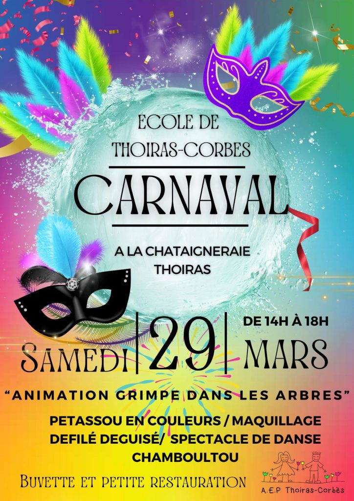 L’A.E.P Thoiras-Corbès vous invite au carnaval de l’école samedi 29 mars de 14h à 18h. Animations, buvette et petite restauration sur place. Rendez-vous à la châtaigneraie de Thoiras.