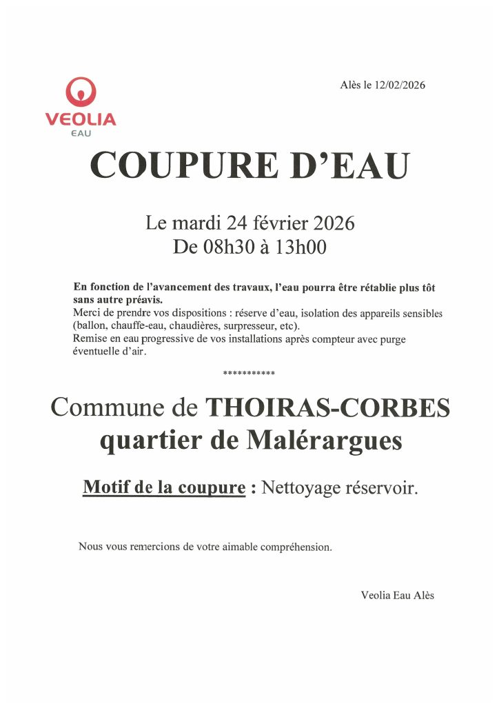 Coupure d’eau prévue mardi 24 février de 8h30 à 13h00 pour nettoyage du réservoir