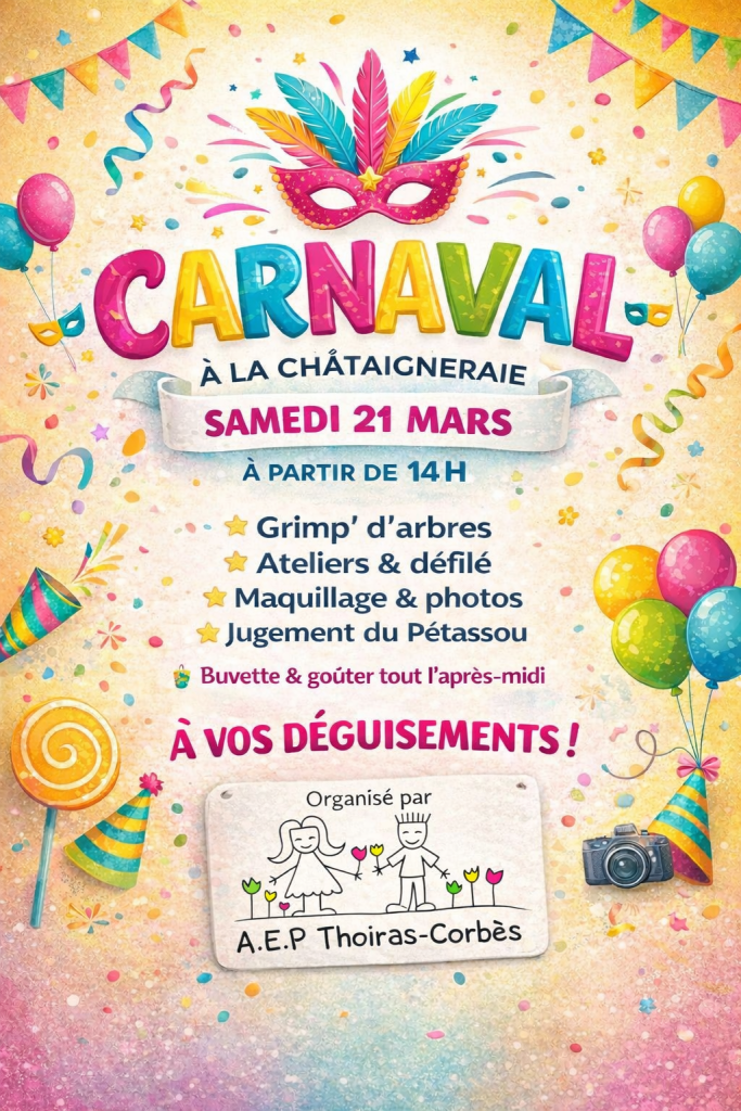 Carnaval organisé par l’A.E.P de l’école de Thoiras-Corbès le samedi 21 mars de 14h à18h Au programme : ★ Activité grimpe dans les arbres ★ Atelier de décoration de masques ★ Atelier maquillage ★ Atelier photo avec cadre décoré ★ Défilé déguisé : comme un défilé de mode avec de la musique et des paparazzis […]