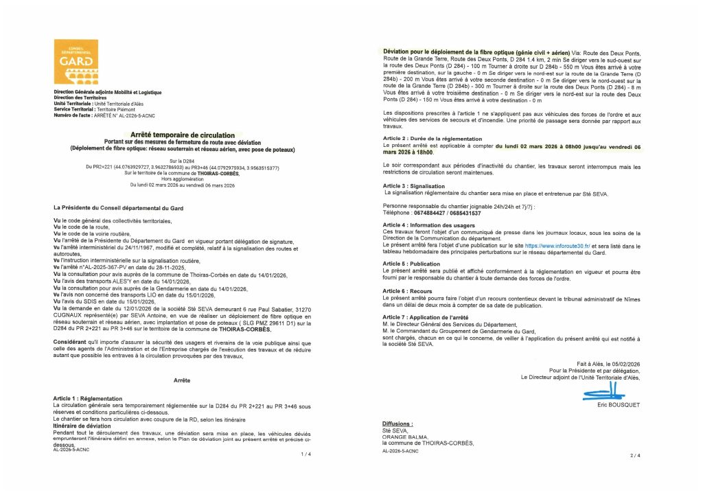 Fermeture de route du 16 au 20 mars Veuillez vous référer à l’arrêté ci-dessous : Arrêté temporaire de circulation