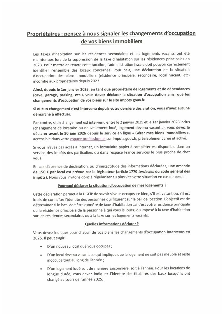 Les taxes d’habitation sur les résidences secondaires et les logements vacants ont été maintenues lors de la suppression de la taxe d’habitation sur les résidences principales en 2023. Pour mettre en œuvre cette taxation, l’administration fiscale doit pouvoir correctement identifier l’ensemble des locaux concernés. Pour cela, une déclaration de la situation d’occupation des biens immobiliers (résidence principale, secondaire, local vacant, etc) incombe aux propriétaires depuis 2023.