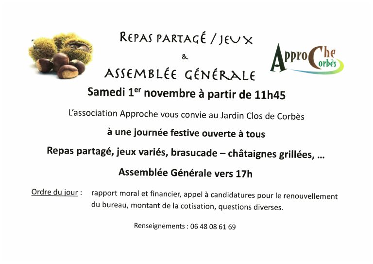 L’association APPROCHE organise une journée festive ouverte à tous le samedi 1er novembre à partir de 11h45 au jardin clos de Corbès.