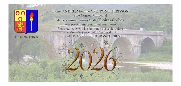Lionel ANDRÉ, Monique CRESPON-LHERISSON et le Conseil Municipal de la commune de Thoiras-Corbès ont le plaisir de vous convier à la traditionnelle cérémonie des vœux qui se tiendra le vendredi 30 janvier 2026 à partir de 19h à la salle Pellegrine, sur le site de La Châtaigneraie à La Plaine.